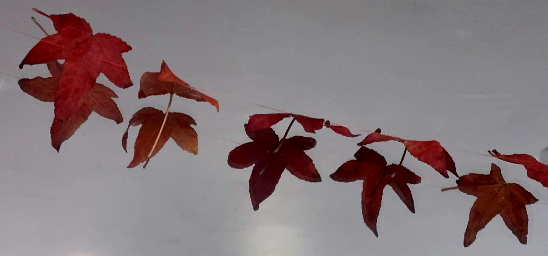 Today I felt inspired to make a garland of autumn leaves, my daughters talked about celebrating the season with decorations over the summer. So when I saw a young tree in my local park with a scattering of beautiful burgundy red and orange leaves around its base, I decided now was the time. I have learnt that you cannot wait for others to start things ie my daughters to choose the leaves under duress of my encouragement. Life starts now, in this moment, the moment where we decide to empower ourselves and do the thing that will bring us joy. I knew that picking up the leaves and piercing them in the perfect place carefully with my needle and orange thread would bring me closer to the rich changing colours of each leaf.